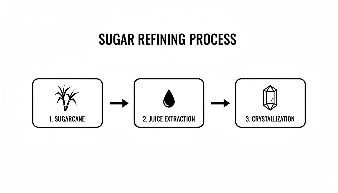 This diagram breaks down the basic journey from a whole plant to pure sugar crystals.