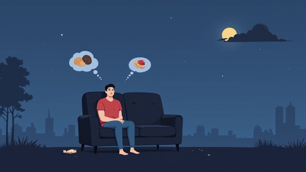 That intense urge to binge eat at night isn't a sign of weakness or a failure of willpower. It’s actually a predictable outcome—a perfect storm created by the collision of your daily habits, your biology, and your emotions. It often strikes when daytime food restriction meets end-of-day exhaustion, leaving your defenses at their absolute lowest.