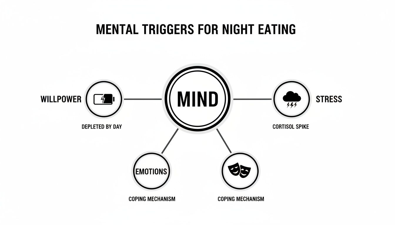 | Habit & Routine | Nighttime eating can become an automatic behavior linked to cues like watching TV or finishing work, done without real hunger. |